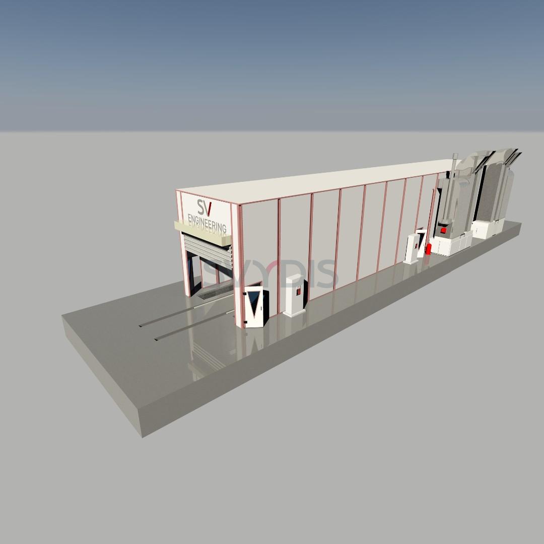 Комплекс подготовки и окраски проходного типа для колёсной техники предназначена для подготовки поверхности, мойки, обеспыливания, обезжиривания, маскировки, а также нанесения на изделия лакокрасочных покрытий и их сушке при повышенной температуре.